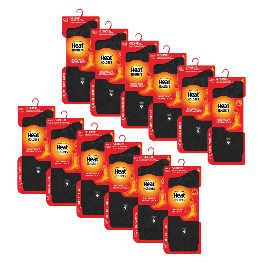 Enjoy this 12 pack of 6 of our Men's Original Finch Thermal Socks and 6 of our Ladies Original Socks in Black. These thermal socks are sure to keep your feet warm on even the coldest days. The inside of each of these thick thermal socks has been intensively brushed to feel super soft and trap warm air close to the skin keeping your feet warmer for longer.